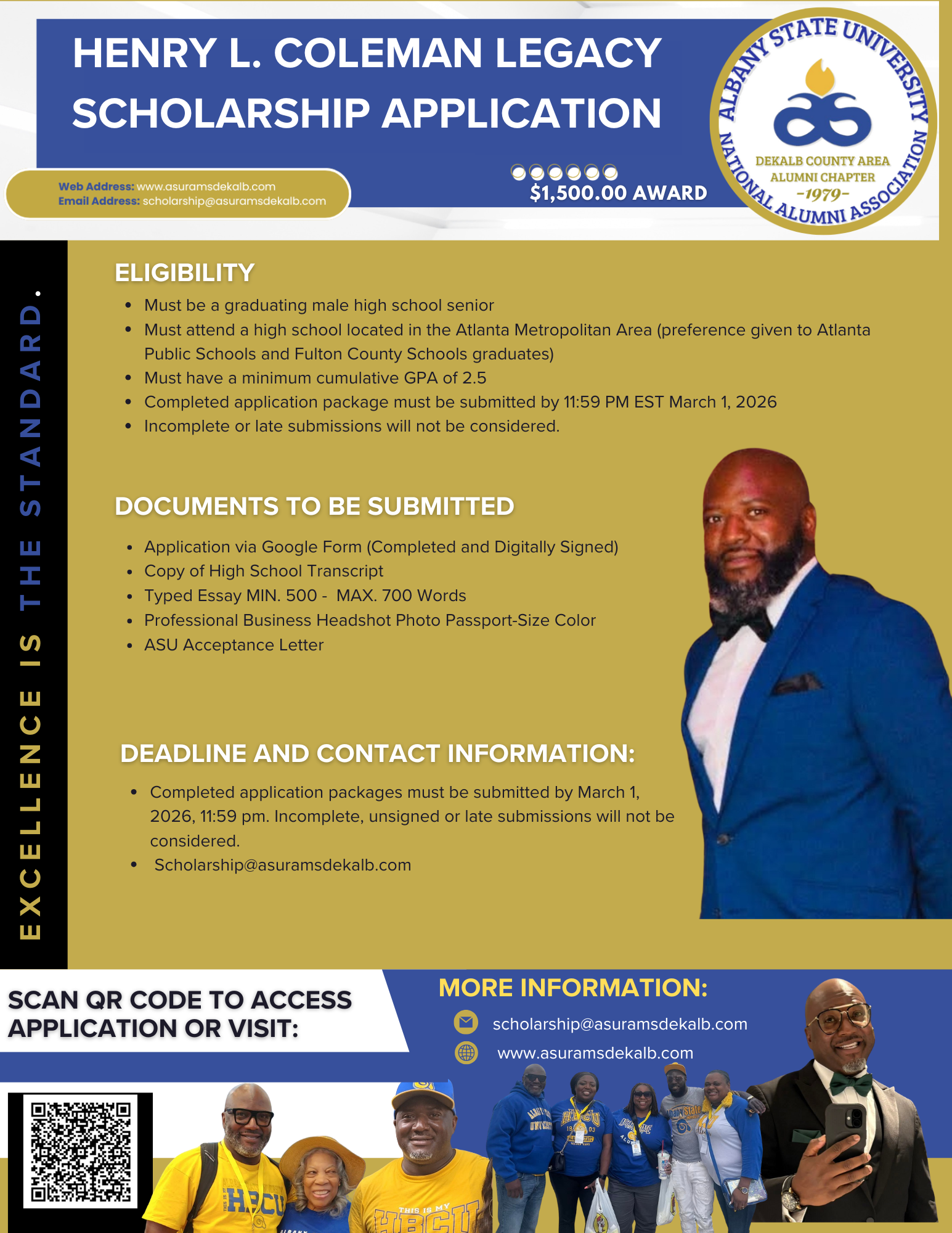 Henry L. Coleman was a devout Albany State Alum whose Golden Ram pride ran deep. As a dedicated member of the DeKalb Chapter, he lived the mission of ASU every day, always reaching back to pull the next generation forward. This annual scholarship is our way of ensuring that Henry L. Coleman's legacy of unwavering passion for education and mentorship, combined with his love for his "Unsinkable" Alma Mater, continues to shine through in the generations of young men who will follow in his footsteps.